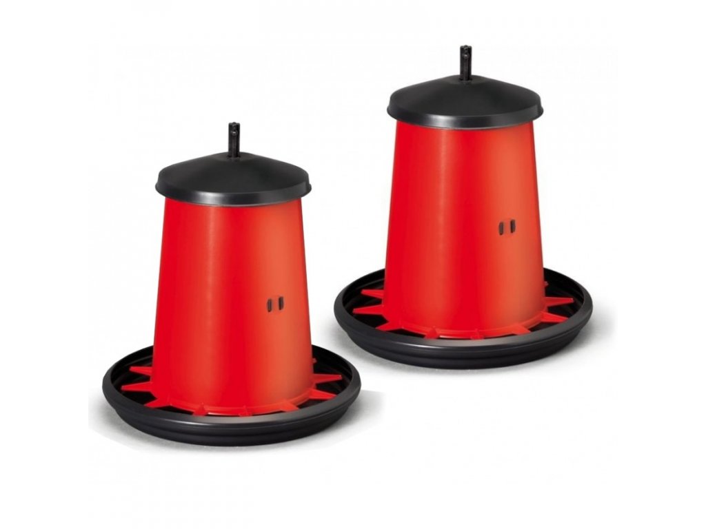 Závěsný krmný automat pro drůbež s plastovou středovou tyčí k regulaci krmné dávky. Zavěšením krmného automatu se snižuje riziko kontaminace krmení. Středová tyč má 3 otvory, které umožňují posun desky. Krmná dávka se nastaví pomocí zástrčky, která se zasune do otvoru a tím se válec upevní v požadované výšce.